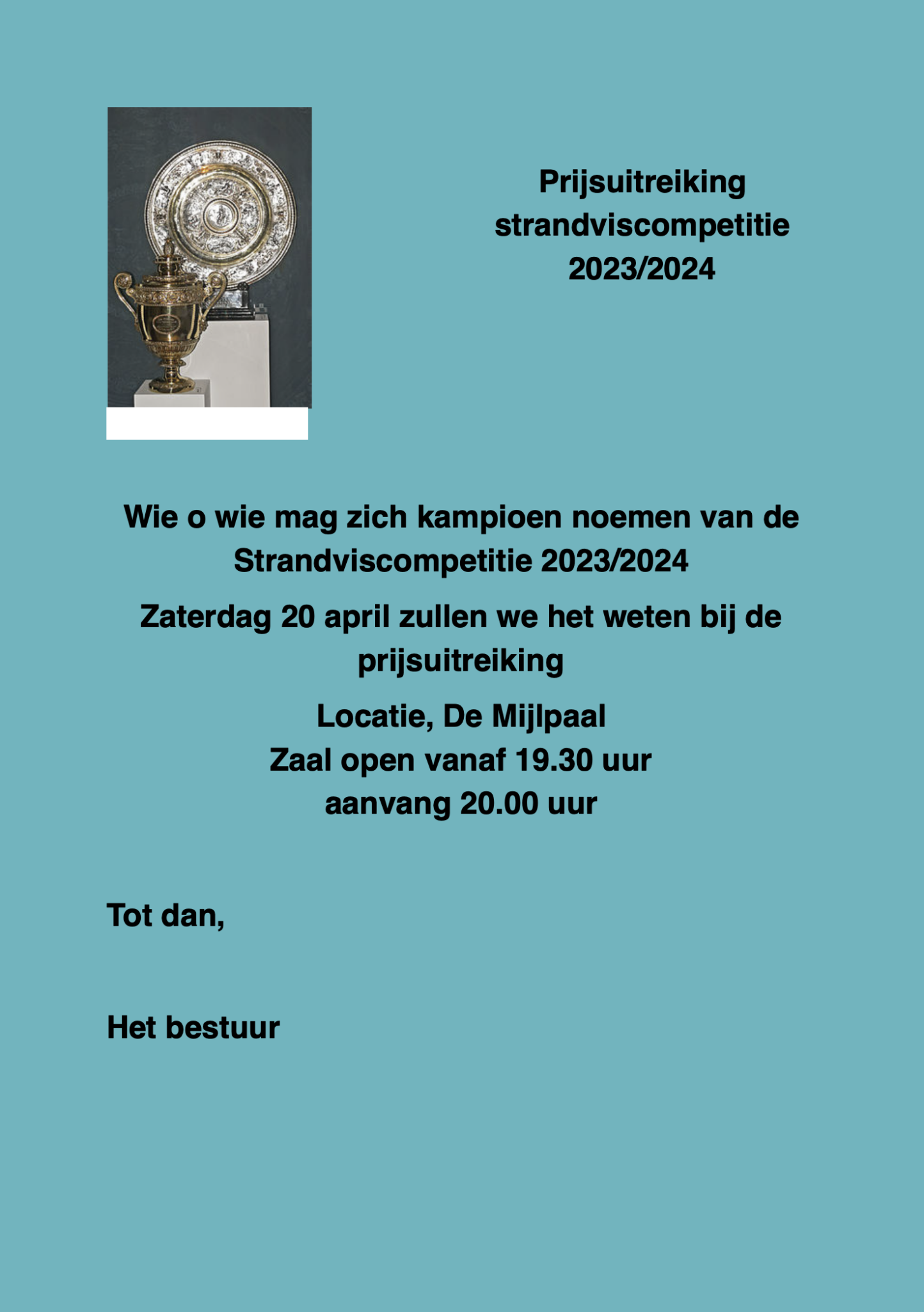Wie o wie mag zich kampioen noemen van de Strandviscompetitie 2023/2024. Zaterdag 20 april zullen we het weten bij de prijsuitreiking.